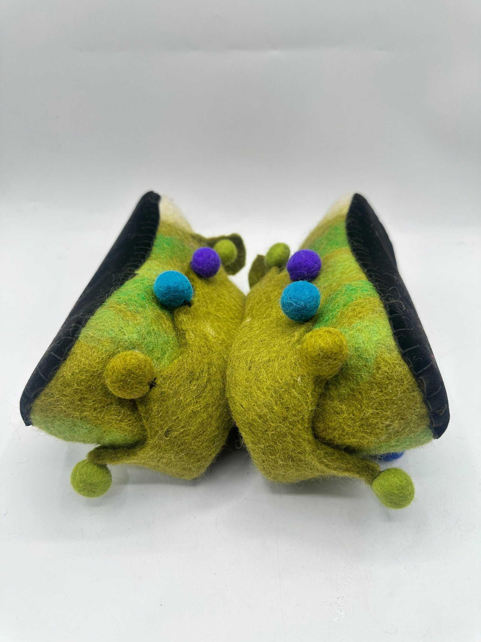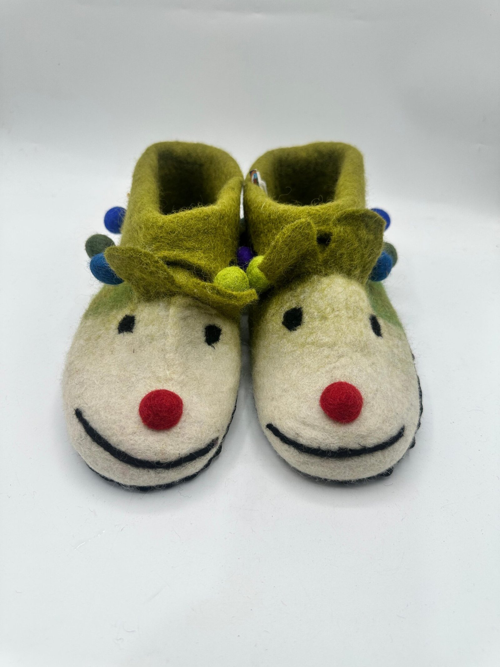 Tags: cheerful jester slippers, clown face slippers, cozy house slippers, green felt slippers, Handmade Felt Slippers, Nepali felt slippers, wool felt slippers