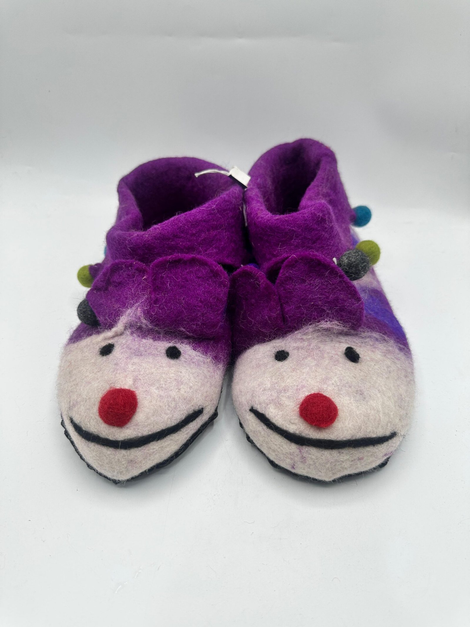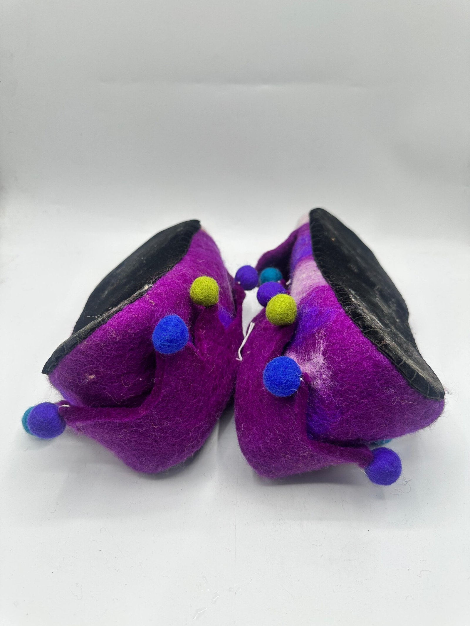 Tags: artisan felt slippers, clown felt slippers, colorful felt slippers, cozy wool slippers, fun house slippers, Handmade Felt Slippers, handmade wool footwear, indoor felt shoes, jester felt slippers, Nepali felt slippers, purple felt slippers, warm wool slippers, whimsical felt slippers, wool felt slippers